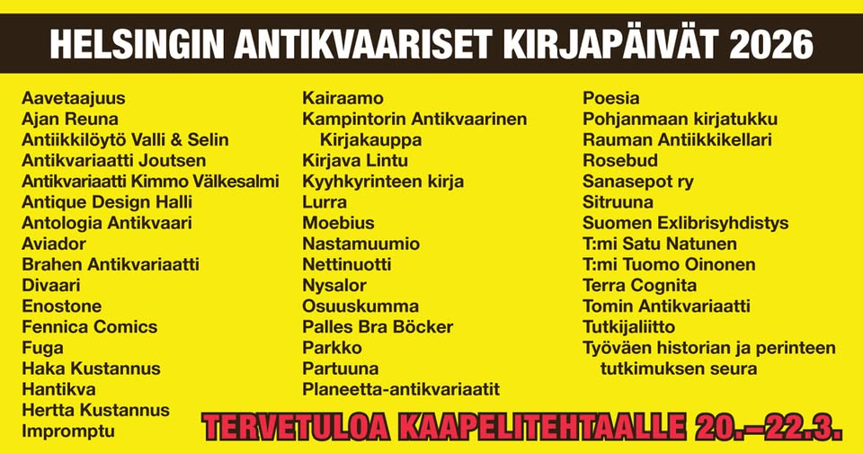 Helsingin Antikvariset kirjapäivät vol.4 Helsinki20.3.2026 klo — 22.3.2026 Vapaa pääsy→ Lue lisää järjestäjän Helsingin antikvariset kirjapäivät sivuilta. Helsingin antikvaaristen kirjapäivien kauppiaat esittäytyvät ja toivottavat teidät kaikki tervetulleiksi Kaapelitehtaalle 20.-22.3. Paikalla on 44 antikvariaattia ja pienkustantajaa! Vapaa pääsy!