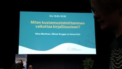 Kello viisitoista olen palannut jälleen jonkin minua suuremman johdattelemana Töölö-lavan luokse. Kirjailija Hanna Ryti haastattelee Gummeruksen Niina Miettistä ja Poesian Mikael Bryggeriä. Tästä minä pidän ja tunnelma on lämmin. Kaupallisuuden häly on kaukana takanani, kun koko katsomo pohtii, millainen on kirjailijan ja kustannustoimittajan kohtaaminen. Yhtä kirjailijatyyppiä, yhtä toimittajatyyppiä ei kukaan etsi, mutta nopeasti käy ilmi, että toimittajan ammattitaitoa on antaa työlle ja vuorovaikutukselle aikaa.